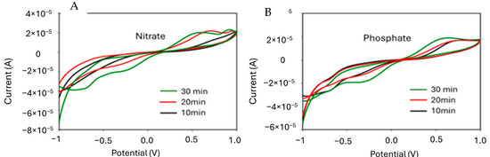 21]. However, in order to facilitate real-time and direct sensing, the calibration curve was obtained by using nitrate and phosphate standard solutions instead of ferri–ferro solution. The typical cyclic voltammetry scans obtained for different concentrations of nitrate ranging from 1 M to 100 µM in water using nitrate MIP sensors at 50 mV/s are shown in