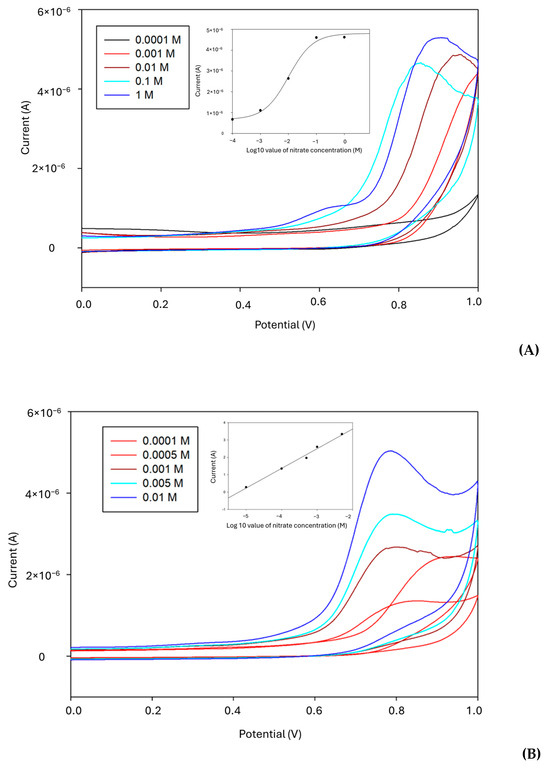 Figure 5B. At lower concentrations, a more pronounced trend in the linearity of the current was observed. This indicated that at 0.8 V, the straight fit showed a stronger correlation with the nitrate concentration, with an accuracy of R