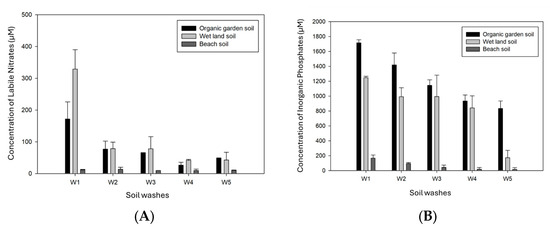 Figure 8A). It was observed that the organic garden soil displayed a similar trend, with an initial concentration of 180 µM during the first wash followed by a substantial reduction in the following washes. This phenomenon can be attributed to the anionic nature of nitrate, which shares the same charge as the soil surface, facilitating its movement with soil water into groundwater [