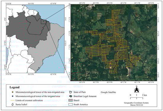 Located in the municipality of Santa Izabel do Pará, Pará, Brazil (Figure 1), Farm Reunidas Sococo (−01°12′36″ S; −48°04′48″ W) served as the site for the experiment. The region is classified as having an “Am” climate subtype according to the Köppen–Geiger system, with a yearly average temperature of 26 °C and annual precipitation surpassing 2000 mm. Rainfall is unevenly distributed throughout the year, with a rainy season lasting from December to July, followed by a dry season from August to November [21,22,23].