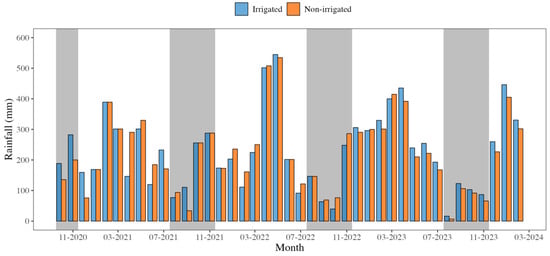Monthly rainfall in an irrigated and non-irrigated green dwarf coconut growing area under humid tropical climate conditions. Shaded areas refer to the region’s dry period.