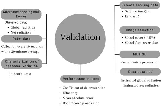 The Student’s t-test was applied using the R 4.2.2 software [32] to assess significant differences between the means of the ratio of net radiation to global radiation (Rn/Rg), identifying variations across areas, seasons, and spatially within and between rows. The same test was used for the albedo and leaf temperature variables, considering the two evaluated areas and the types of vegetation cover. The validation of the satellite image was carried out using the point data extracted from the pixels corresponding to the micrometeorological towers and the observed data from the pyranometer sensors for global radiation and the net radiometer for net radiation. The performance of the estimation model was quantified using the following performance indices: coefficient of determination (R2), efficiency (Ef) [33], mean absolute error (MAE%), and root mean square error (RMSE%) [34]. A schematic containing a methodological summary can be seen in Figure 3.