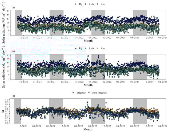 Temporal variation in global radiation (Rg, MJ m−2 day−1), net radiation in the row (Rnr, MJ m−2 day−1) and in the inter-row (Rnbr, MJ m−2 day−1) in a non-irrigated (a) and irrigated (b) green dwarf coconut palm cultivation area, and atmospheric transmittance (kt) (c) in Northeastern Pará, Brazil. The shaded area corresponds to the dry season of the region.