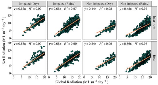 Simple linear regression between incident global radiation and the radiation balance in the row and inter-row during the rainy and dry periods in irrigated and non-irrigated green dwarf coconut plantations in Northeastern Pará, Brazil. The solid orange line represents the regression line and green circles represent observation points.