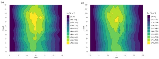 Hourly seasonal distribution of incident global radiation (Rg, W m−2) in irrigated (a) and non-irrigated (b) green dwarf coconut plantations under the climatic conditions of Northeastern Pará, Brazil.