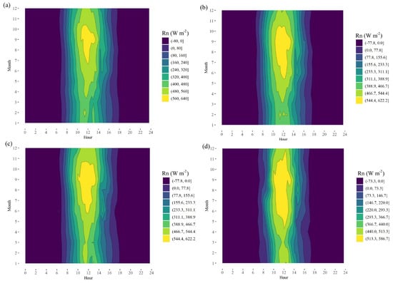 The times of day with the greatest energy availability coincide with the peak global radiation incidence. Thus, the period from 10:00 a.m. to 2:00 p.m. has the highest energy supply (Figure 7). Similar results have been reported in areas of the Amazon rainforest in the Tapajós National Forest region, where higher values of net radiation (400 to 500 W m−2) were observed between 2:00 p.m. and 4:00 p.m., coinciding with the maximum incidence of global radiation [38]. In Capitão Poço–PA (−1.74°; −47.06°), the highest Rn totals ranged from 450 to 650 W m−2 during the 10:00 a.m. to 2:00 p.m. period [1].