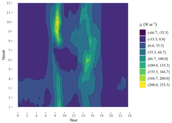 Seasonally, the most significant differences in net radiation between the two areas occurred between 07:00–10:00 and 14:00–16:00, with variations ranging from 100 to 233.3 W m−2. The greatest intensity was observed between August and November, particularly from 07:00 to 10:00 (Figure 9). This pattern suggests that the angle of solar radiation during these hours has a greater capacity to create spatial differences in net radiation between the row and inter-row.