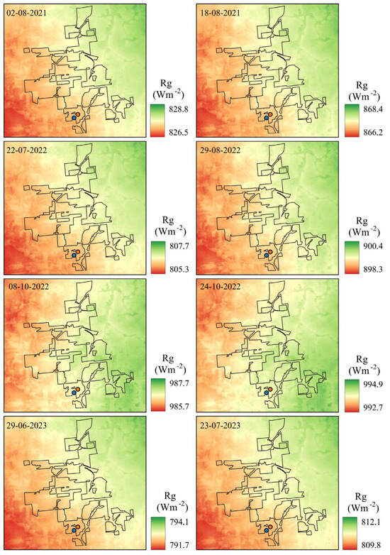 Considering the spatial analysis, eight images were obtained after applying the cloud cover filter. It is worth noting the limited number of images available during the experimental period (August 2020 to February 2024), which highlights the challenge of obtaining these variables in the region due to the high cloud cover characteristic of the Amazon. Thus, global radiation ranged from 791.7 W m−2 to 994.9 W m−2 in the analyzed images, with the highest incident radiation totals occurring in the easternmost part of the farm (Figure 10).