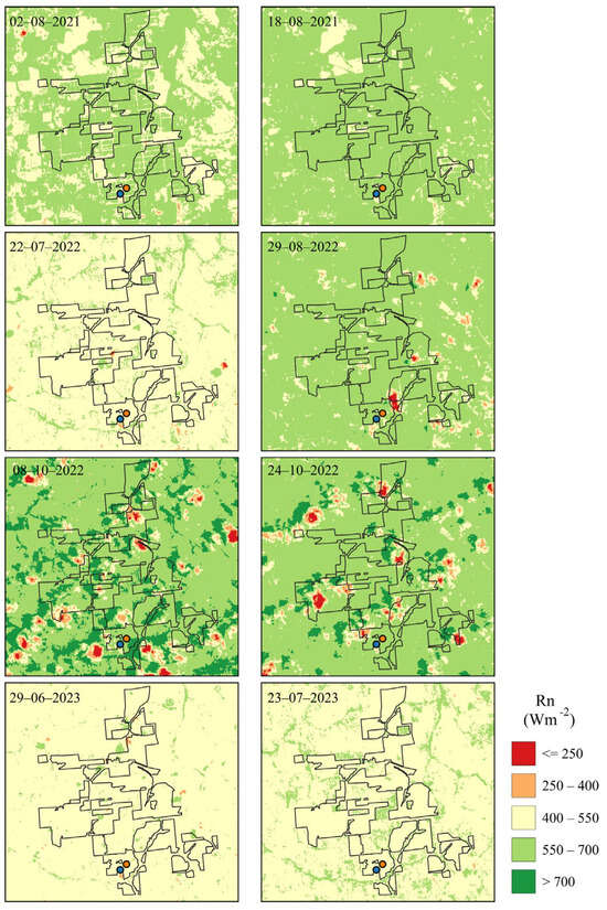 There are five classes of variation for net radiation in this variable, with the 400–550 W m−2 and 550–700 W m−2 classes being predominant in the area (Figure 11). The images obtained in August and October 2022 stand out due to the presence of regions with Rn values lower than 250 W m−2, which can be attributed to the high occurrence of cloud cover on those dates.