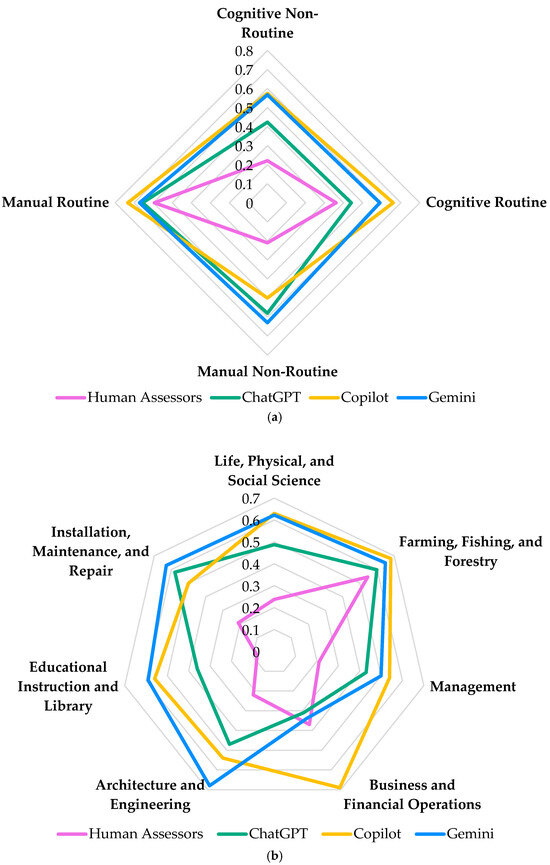 Spider charts illustrating the susceptibility rate to robotization based on (a) the nature of tasks within an occupation and (b) the classification of the reviewed occupations into major groups, both according to [30], as evaluated by large language models, namely ChatGPT, Copilot, and Gemini, and human assessors.