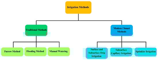 In general, there are two types of irrigation techniques: pressure-driven (modern techniques) and gravity-driven (traditional techniques) (Figure 1). It is well known that farmers using gravity-driven techniques administer the same amount of irrigation water throughout the farm, ignoring crop water requirements and field variations [14,15]. Additionally, this method supplies water without the need for pumps or outside pressure, instead of relying on the field’s slope or water velocity, which leads to water stress for crops due to non-uniformity in water distribution. On the other hand, the pressure-driven system uses external pumps to deliver water under pressure, which results in higher WUE and improved crop yields [16]. Additionally, this method involves applying water and nutrients to plant roots in drop-to-drop or mist forms in a target-specific manner [17]. In a comparable manner, pressure-driven irrigation accounts for more effective and efficient irrigation applications (65–95% for drip irrigation (drip irrigation facilitates the localized and gradual application of water to the plant’s rhizosphere, utilizing a network of pipes, tubing, and emission devices) and 50–90% for sprinkler irrigation (Sprinkler irrigation applies water aerially, mimicking rainfall, via nozzles or sprinkler heads that cover a broad area)). However, it can be less water-efficient than drip irrigation due to evaporative losses and wind drift, compared to surface irrigation efficiency (50–70% for furrow (Furrow irrigation utilizes parallel channels between crop rows to guide water, which infiltrates the soil via gravity to reach plant roots. Uneven land leveling can result in non-uniform water distribution), 40–60% for border (Border irrigation involves dividing the field into long, narrow, sloping strips, delineated by earth embankments. Water flows down these borders in a shallow sheet, making it suitable for close-growing crops and pastures. Proper land grading is essential for relative efficiency), and 40% for basin irrigation (Basin irrigation involves dividing the field into level areas, enclosed by earth embankments, which are then flooded. This method, while suitable for flood-tolerant crops like rice, is notably water-inefficient [18])). Therefore, combining smart irrigation technologies can be a step forward to enhance WUE and water consumption overall, considering the advantages and disadvantages of all irrigation applications [5].