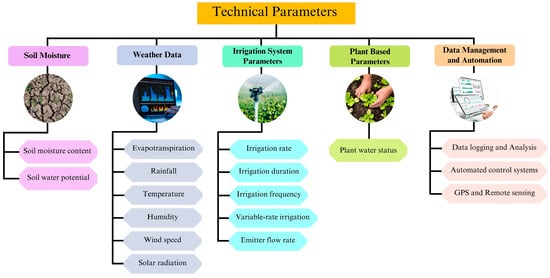 In the traditional agricultural industry, precision irrigation techniques, also known as smart or digital irrigation, have revolutionized effective water usage and management [6]. It consists of several sensors and actuators (such as water valves and pumps) that monitor and control soil and weather parameters. For example, to open or close the actuators, the sensors continuously update the controllers with climate and real-time soil data from the field [7]. Hence, through employing a variety of technologies and monitoring real-time field data, precision irrigation techniques track and regulate the plants’ irrigation water supply by providing accurate watering according to plant needs and health status. According to studies, precision irrigation offers a viable way to maximize WUE and increase agricultural output by reducing environmental footprints in a time when water resources are becoming increasingly scarce, and sustainability is imperative [19]. The following are the main technical parameters for precision irrigation to achieve an efficient WUE and can be viewed through Figure 2.