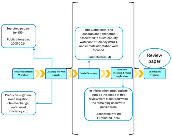 To compare smart irrigation technologies and evaluate prospects for water conservation and sustainable agriculture, this study was conducted collecting pertinent data and information from 2005 to 2024 using key words such as precision irrigation, deficit irrigation, smart irrigation, IoT-based irrigation, water use efficiency, modern irrigation tools, smart irrigation monitoring tools, crop yield, smart irrigation control tools, nutrient leaching, greenhouse gas emissions, smart irrigation architecture, and irrigation models, along with climate change-related terms. The information drawn from published academic literature on precision irrigation water-saving systems was then reconsidered based on the abstract, titles, and conclusions. Online scholar databases, such as Google Scholar, PubMed, Web of Science, Scopus, ResearchGate, MDPI, Cambridge Journals, IEEE Xplore, Taylor & Francis, Wiley Online Library, ScienceDirect, and Springer, were used to collect published materials. From an initial search of 150 publications, 110 were deemed relevant for information synthesis, aimed at answering the research questions posed. The remaining 40 were excluded based on predefined criteria, specifically due to their deviation from the review’s scope. The systematic literature review process followed is shown in Figure 3.