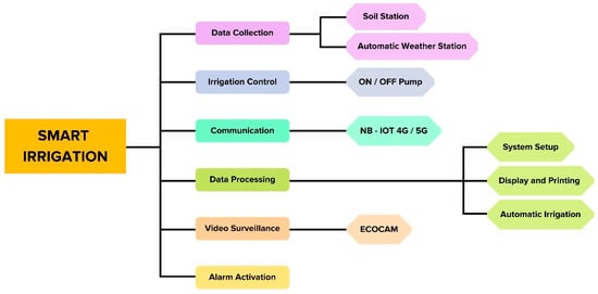 In addition to increasing the possibility of water logging or underwatering in the field, poorly managed irrigation patterns can impact WUE and crop performance. By increasing the likelihood of leaching nutrients, limiting growth, and causing water, energy, and nutrient loss, these situations may contribute to harmful environmental consequences [20]. As a result, precision irrigation scheduling (PIS) is a good substitute that minimizes overapplication, leading to reduced water loss and maintaining the amount and timing of water application in accordance with plant needs [21]. Understanding the active function of land water usage is also necessary for effective irrigation systems, real-time weather, soil property, plant physiology information, and studies based on climate change and hydrology [22]. Therefore, meteorological sensors, variable rate irrigation methods, remote sensing, geographic information systems, soil moisture, plant water uptake sensors, and decision support system tools are a few of the essential elements of PIS. Water conservation, increased crop yield, financial savings, and environmental protection are aided by their incorporation into agricultural applications. However, adopting the PIS presents several difficulties, such as the initial settlement cost, managing substantial amounts of data, and the need for knowledgeable and experienced technical personnel [5,23]. Various components and range of processes involved in the smart irrigation application are represented in Figure 4.