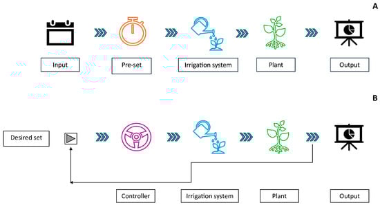 Figure 8. Block diagram: (A) Open-loop control irrigation system (B) Closed-loop control irrigation system.
