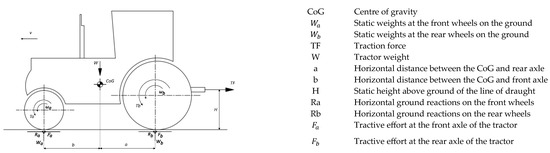 where a is the horizontal distance between the CoG and the rear axle and b is the horizontal distance between the CoG and front axle. Considering the dynamic load, related to the static height of the line of draught H with respect to wheelbase Z = a + b above the ground, as well as the horizontal pull force value, the dynamic axle load is:
