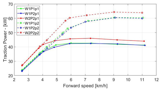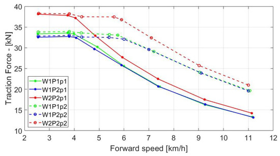 The drawbar power is reported for the six configurations in Figure 7. The considered forward speed is the effective speed, meaning that the wheel speed was reduced by the component ascribed to wheel slip.