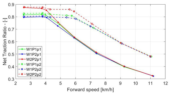 The drawbar pulling force results under the six test configurations are presented below. The net traction ratio was obtained according to Equation (1). The traction force (Figure 5) and net traction ratio (Figure 6) are presented with respect to the tractor’s forward speed. The results pertaining to the tractor with the lower-power engine are presented as solid lines, while the results for the tractor with the higher-power engine are shown as dotted lines.