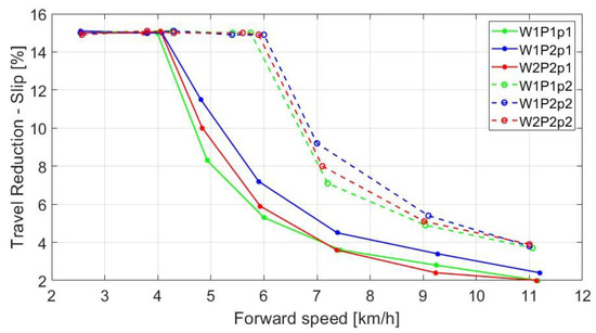 The trend of slip as a function of forward speed is shown in Figure 8. Slip at low speeds was constant at 15%, while the measured values decreased above 4 km/h for the low-power tractor and above 6 km/h for the high-power tractor. The same behaviour was verified for all six configurations tested for the two compared tractors.