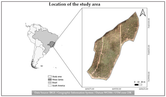 The study site (Figure 2) consisted of a 1.2 ha coffee plantation of the species Coffea arabica, specifically the Topázio MG1190 cultivar. The spacing between coffee rows was 3.70 m and between plants 0.70 m. The area is located in the municipality of Três Pontas, the southern region of the state of Minas Gerais, at 905 m altitude and with UTM coordinates S7640030.4 and E449531.5, zone 23K.