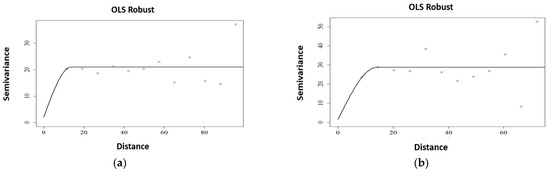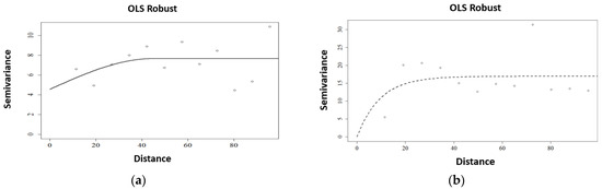 Ref. [55] reported that, in geostatistical modeling for soil science studies, the spherical model is the most frequently applied. However, semivariogram adjustments related to soil properties are often observed for both spherical and exponential models.