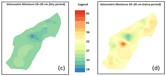 The kriging maps for volumetric moisture at a depth of 0–10 cm (Figure 8a,b) predominantly varied from 20% to 27% in the dry season and from 30% to 42% in the rainy season. The spatial map of volumetric moisture at a depth of 10–20 cm (Figure 8c,d) indicated a predominant range of 23% to 27% in the dry season and 32% to 36% in the rainy season.