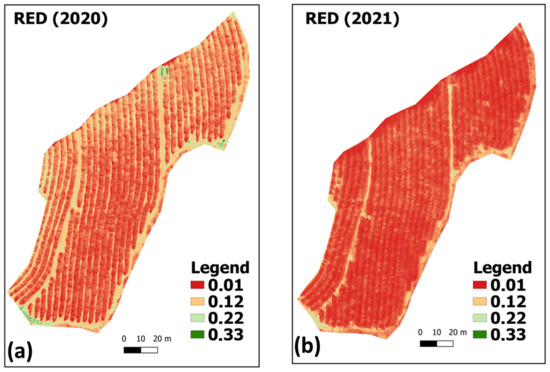 Figure 9a illustrates the reflectance of the red band during the dry season, where lighter tones indicate exposed soil or sparse vegetation, while darker tones suggest denser vegetation cover or higher soil moisture. In Figure 9b, representing the rainy season, an overall reduction in reflectance was observed, indicating increased vegetation density or soil moisture.