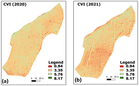 Studies by [42] indicate that CVI exhibits high sensitivity to leaf chlorophyll concentration. Moreover, even in soils with significant reflectance variability due to moisture, CVI maintains a stable linear relationship with chlorophyll concentration, particularly under extreme conditions of completely dry or wet soil. This result highlights the robustness of the index in adapting to soil moisture variations.