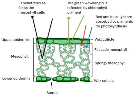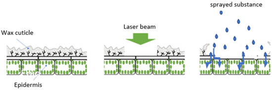- Initial state prior to laser treatment—The leaf surface is covered by the wax cuticle (gray layer), which acts as a natural barrier limiting the penetration of external substances. Beneath the cuticle, the epidermal and palisade mesophyll cells remain protected.