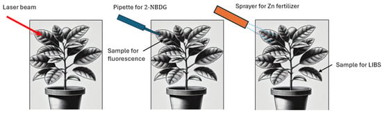 It is important to note that the LIBS spectra were captured from a leaf different from the one where the laser treatment was applied, specifically from a position indicated in Figure 3—that is, from leaves collected approximately 1 m away from the leaf where the spray was applied.
