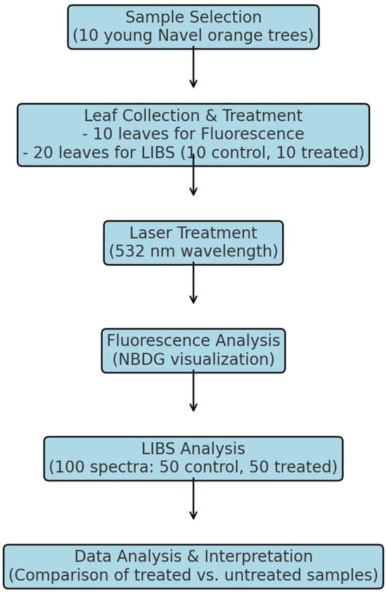 To enhance clarity in the experimental workflow, Figure 3 presents a schematic representation of the methodology used in this study. The process begins with sample selection, where 10 young navel orange trees were chosen. Leaf collection and treatment followed, with 10 leaves designated for fluorescence analysis and 20 leaves (10 control and 10 treated) used for LIBS analysis. The next step involved laser treatment using a 532 nm wavelength laser to selectively remove the wax cuticle. After treatment, fluorescence analysis was performed using NBDG to assess substance penetration, while LIBS analysis measured Zn uptake, generating 100 spectra (50 control, 50 treated). Finally, the data from both analyses were processed and interpreted to compare the uptake efficiency between treated and untreated samples. This structured workflow ensures reproducibility and highlights the sequence of key steps in the study.