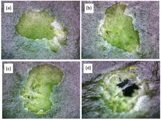 Laser fluence working window for wax cuticle removal. The images illustrate the laser’s effect on wax cuticle removal at various fluence levels: (a) 1.42 J/cm2, (b) 4.25 J/cm2, (c) 7.08 J/cm2, and (d) 9.91 J/cm2. In subfigures (a,b), the wax cuticle is removed at lower fluence levels, exposing the epidermis without visible damage. At a moderate fluence level in subfigure (c), minimal epidermal ablation is observed, while in subfigure (d) the highest fluence results in pronounced epidermal ablation.