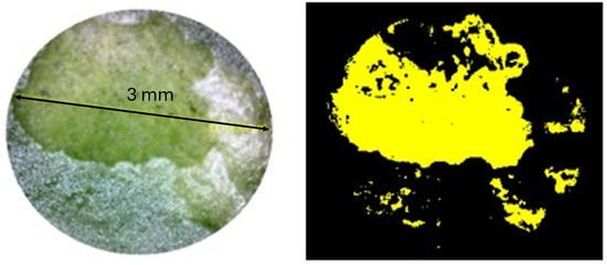 To evaluate the extent of the laser-treated area that resulted in exposed epidermis with the cuticle removed, microscope images were processed using a program created in Python 3.11. The cursor tool was used to define the regions of interest. The image processing algorithm was based on color segmentation in the HSV (hue, saturation, value) color space and binary mask processing. The methodology can be mathematically described as follows: