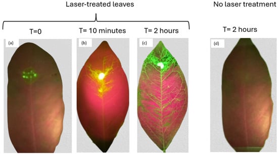 To demonstrate the effectiveness of laser treatment in facilitating the penetration of externally applied substances into the leaf and their movement through the plant vasculature, we applied fluorescent NBDG to laser-treated areas (Figure 6). The images were captured using a fluorescence filter. A control untreated leaf is shown on the right side of Figure 7. In contrast, Figure 7a displays the treated leaf at the moment of glucose application, Figure 7b shows the leaf 10 min after treatment, and Figure 7c presents the fluorescent glucose distribution 2 h post-application.