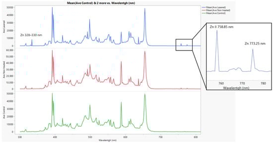 Figure 10 presents the LIBS spectra obtained for different treatment conditions. The spectral comparison reveals a clear enhancement in Zn detection in the laser-treated sample (blue spectrum). In particular, the characteristic peaks of Zn I (328–330 nm) and Zn II (758.9 nm) are only observed in the laser-treated condition, confirming the successful penetration of the foliar fertilizer into the plant tissue when combined with laser pre-treatment. In contrast, these Zn signals are absent in both the control (green) and the non-treated (red) samples, indicating limited uptake under standard foliar application conditions. The Zn I peaks (328–330 nm) have been reported in previous studies on Zn detection using LIBS due to their intensity, easy detection, and distinctive recognizability [16].