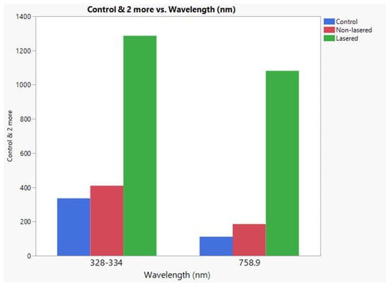 Figure 11 presents the intensity comparison of the Zn I (328–334 nm) and Zn II (758.9 nm) atomic emission peaks obtained through LIBS analysis under different treatment conditions. The control sample (blue) represents the natural background levels of zinc in the leaf, while the non-lasered sample (red) corresponds to foliar application of Zn fertilizer without laser pre-treatment, mimicking standard application conditions. The laser-treated sample (green) represents the condition where Zn fertilizer was applied to an area that had undergone selective cuticle removal via laser treatment.