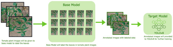 For detecting tomato leaves in tomato plant images, we employed the YOLOv8 model. YOLOv8 was preferred because of its ability to detect objects in real time with high accuracy and low computational cost. The boxes were automatically encased around the tomato leaves themselves by using YOLOv8, which was later refined through SAM. YOLOv8 was employed for detection tasks. The network was initialized using the pre-trained weights from the COCO dataset and then adjusted to the tomato leaf dataset. Unlabeled data for YOLOv8 were annotated using the autodistill. With the help of autodistill, we can train small, faster-supervised models with big slower foundation models. Using autodistill we can create labeled data to inference on a custom model running on the edge. For using the autodistill, the unlabeled data is given to the base model, which uses ontology to mark the dataset labeled that is used to train the targeted model, which outputs a distilled model fine-tuned to perform a specific task. The autodistill process is shown in Figure 2.