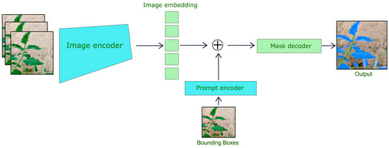 Segment Anything Model (SAM) is used to segment the tomato leaves within YOLOv8 bounding boxes. The SAM has also been designed as a prompt-based segmentation model, whereby once a bounding box or points are provided as prompts to it, fine segmentation occurs. Our focus was targeted segmentation, so we implemented SAM ViT-H (Vision Transformer with a hierarchical structure) and trained on large-scale datasets amenable to segmentation tasks. We picked up a pre-trained checkpoint (“sam_vit_h_4b8939.pth”), which was tailored to our task. For speed of inference, the model was executed on 2 GPU 12GB NVIDIA GeForce GTX 1080 Ti. For generating high-quality segmentation masks, SAM is used for each detected bounding box from YOLOv8, as shown in Figure 3.
