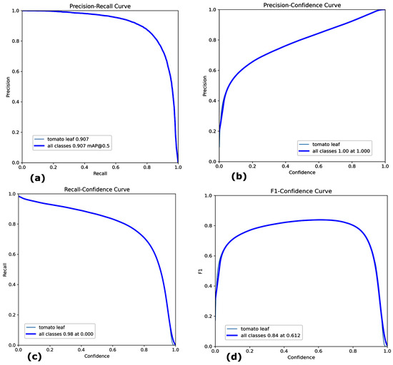 Figure 4. Performance Metrics of YOLOv8 (a) Precision–Recall Curve (b) Precision–Confidence Curve (c) Recall–Confidence Curve (d) F1–Confidence Curve. - Precision, Recall, and F1 Score: To assess the quality of the segmentation masks, precision, recall, and the F1 score were determined for every image at the pixel level. The Precision curve measures the proportion of correctly predicted positive pixels. The Recall curve measures the proportion of actual positive pixels that were correctly predicted. The F1 Score is the harmonic mean of precision and recall. Precision was 100% shown in Figure 4b, while recall was 98%, as shown in Figure 4c, reflecting the model’s capability to detect the tomato leaves and minimize false positives correctly.