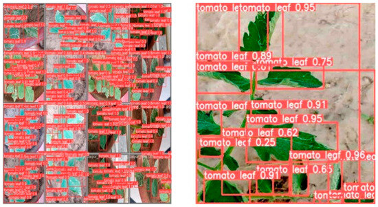 - Mean Average Precision (mAP): The model achieved a mAP of 90.7% with a confidence threshold of 0.5. This is shown in Figure 4a, which indicates the high accuracy of detection of tomato leaves on different tomato plant images.