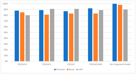 This demonstrates the performance of the model under different conditions, such as the presence of small leaves and light conditions, which is a common feature in real-world problems. Our proposed approach, integrating YOLOv8 and SAM, has shown convincing performance in terms of detecting, masking, and extracting tomato leaves. It is important to note that other models, such as YOLOv5-X [30], YOLOv6-L [31], YOLOv7 [32], and YOLOv8-SAM [33], has its merits, but the proposed combination of YOLOv8 and SAM has shown a comparable level of effectiveness, as indicated in Table 2. The visualization of comparatives analysis with the previous model with respect to performance metrics and average inference time is shown in Figure 8 and Figure 9.