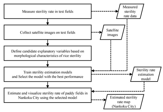 The objectives of this study were to (1) develop an estimation method for high temperature-induced sterility rates based on satellite remote sensing images and (2) map the fields that may be sterile in Nankoku City, Kochi Prefecture, Japan, to visualize areas with a low or high risk of sterility. The sterility rates were measured in 2022 and 2023 using field surveys of rice paddies in Nankoku. Next, the sterility rate estimation variables were defined based on the changes in spectral reflectance. Subsequently, a machine learning model was constructed to estimate the sterility rates using the collected data. The model was used to estimate the sterility rates of rice paddies in Nankoku over three years. The characteristics of sterility occurrence and its impacts are discussed in the Discussion and Conclusions Sections.