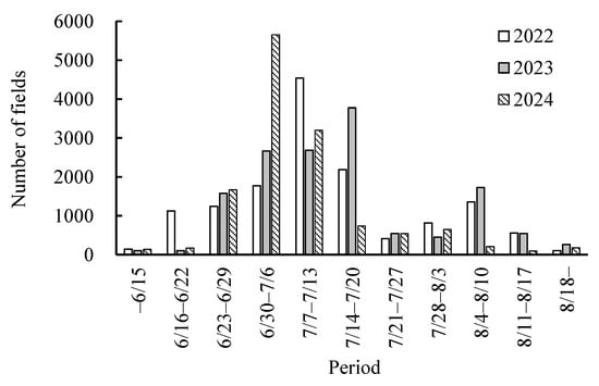 A bias of −1 day in the heading date estimation for the cultivars in the test fields (Table 1) indicated that there was almost no bias in the heading date estimation using the NDVI. Two peaks were observed in mid-July and early August in 2022 and 2023 (Figure 5). Two cropping types, early- and normal-season cultivation, are practiced in Nankoku, and the peaks corresponded to the heading dates of each cropping type. The peak for the early-season cultivation fields appeared between 7 and 13 July in 2022, which was earlier than that in 2023, probably because of the earlier growth caused by the higher temperatures in April and mid-June to mid-July (Figure 3). In contrast, the peak for the normal-season cultivation fields occurred between 4 and 10 August in both years. This may have been because the average daily temperature during the growing season was higher than that for the early-season cultivation, and the difference in the number of days corresponding to the temperature difference was smaller than that of early-season cultivation. In 2024, the heading timing was advanced across all the paddy fields, leading to only one peak being observed between 30 June and 6 July. Paddies under early-season cultivation may have emerged earlier than in other years because of the higher solar radiation in the period up to late June [43]. In addition, paddies under normal-season cultivation may have been introduced because of the high temperatures after July. These results indicate that the method used in this study, although simple, is useful for heading date estimation in areas with multiple cropping types and long growing seasons, such as in Kochi Prefecture.