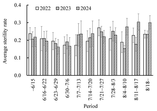 Average of estimated sterility rate for each period. The sterility rate of each field was estimated by a model trained using the sterility rate measured in the field survey area, i.e., the rate of the number of unripe grains to the total number of grains (dimensionless quantity, range: 0 to 1), as training data. The vertical axis shows the average sterility rate in fields that flowered during each period on the horizontal axis. The bars in the figure indicate the standard deviation.