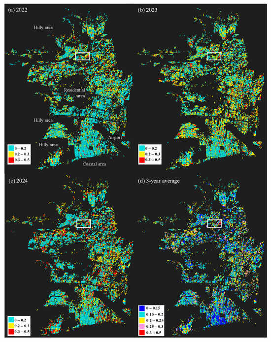 Estimated sterility rate (sr) map for central to southern Nankoku City in (a) 2022, (b) 2023, and (c) 2024. The sterility rate on the map was estimated by a model trained using the sterility rate measured in the field survey area, i.e., the rate of the number of unripe grains to the total number of grains (dimensionless quantity, range: 0 to 1), as training data. For (a–c), light green, yellow, and red colors indicate sterility rates of 0 ≤ sr ≤ 0.2, 0.2 < sr ≤ 0.3, and 0.3 < sr ≤ 0.5. For (d), blue, light green, yellow, pink, and red colors indicate sterility rates of 0 ≤ sr ≤ 0.15, 0.15 < sr ≤ 0.2, 0.2 <sr ≤ 0.25, 0.25 < sr ≤ 0.3, and 0.3 < sr ≤ 0.5. The white rectangle indicates the field survey area (the bottom figure in Figure 1).