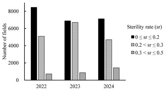 Figure 7 shows the results of color coding the fields based on the estimated sterility rate. Figure 8 shows the number of fields in each sterility class for the three years. In 2022, the fields with high sterility rates (>0.2) were distributed throughout the city in all areas, including hilly, residential, and agricultural areas (Figure 7a). They were most common in the areas located east and north of the residential area, and there were relatively few fields with high rates in agricultural areas located north of the center of the coastal area. In 2023, the fields with a high rate (>0.2) were widespread in the entire region compared to 2022 (Figure 7b). This increase was particularly marked in areas immediately east and south of the residential area. The number of fields with sterility rates exceeding 0.3 (red) also increased compared with that in 2022 (Figure 8). In 2024, the number of fields with a high sterility rate (>0.2) decreased compared to 2023; however, the percentage of fields with a sterility rate exceeding 0.3 increased (Figure 7c and Figure 8). These fields were most common in the areas immediately north and east/southeast of the residential area and south of the airport. Figure 7d shows a map of the 3-year average sterility rate for the fields. The map was color-coded into five levels: the fields with the lowest 3-year sterility rate (blue) were mostly located north of the central coastal area, and the fields with the next lowest rate (light green) were mostly located in the northwest, which was surrounded by hilly areas and located in the agricultural area at the top of the figure. Paddy fields with a large variation in 3-year average sterility rates were found in areas located just north and east of the residential area.