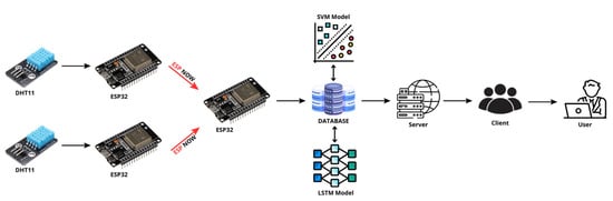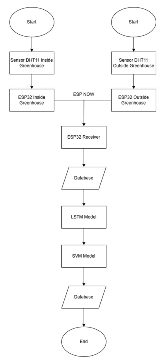 - SVM: The Support Vector Machine algorithm is applied for climate classification, categorizing environmental conditions into predefined labels such as “optimal”, “suboptimal”, or “critical”. By identifying complex relationships within the input data, the SVM enables data-driven decision making to maintain or modify greenhouse conditions as needed [65].