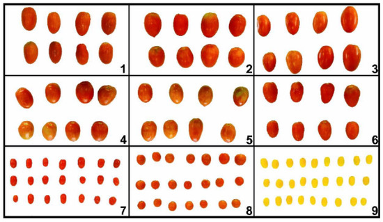 The tomatoes were purchased from producers in the city of Tupã/SP, Brazil (−21.9384, −50.514 21°56′18″ S, 50°30′50″ W), with commercial and non-commercial cultivars, namely ‘1-Katia’, ‘2-Paipai’, ‘3-Wild’, ‘4-Colibri’, ‘5-Milan’, ‘6-Glaziane’, ‘7-Haven Cherry’, ‘8-Cherry 15.916’, and ‘9-Cherry Aiko’.