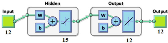 Following multiple trials, it was determined that increasing the number of neurons in the hidden layer from 10 to 15 was necessary. This adjustment was driven by the remarkable similarity among the samples, especially those that produced similar outputs due to common characteristics, justifying the need to increase the number of neurons in the hidden layer. However, from 15 neurons on, the training performance started to deteriorate. Thus, we used the same procedure proposed in [29,30] to initialize the training program several times, using different configurations. The configuration that yielded the highest accuracy during the validation stage—defined by the optimal number of hidden layers and neurons—was saved as the best-performing result. For this work, the ideal configuration was a hidden layer with 15 neurons, using 95% of the samples for training and 5% for validation.