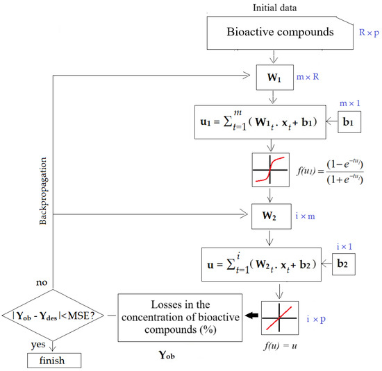 Similar to other types of artificial neural networks, those based on the backpropagation algorithm are frequently regarded as lacking transparency. This perception stems from the difficulty in understanding the reasoning behind their outputs, as these models do not offer clear, interpretable justifications for their predictions. To address this issue, a variety of research efforts have been dedicated to extracting interpretive insights from neural networks and designing methods to explain their behavior in particular scenarios [29,30,31]. It is also important to highlight that retraining a network can lead to variations in the resulting values. Figure 3 presents the flowchart of the ANN applied in this study for estimating the reduction in bioactive compound concentrations throughout the tomato processing stages. The vectors Ydes and Yob represent the desired output (target) via the experiment and the output obtained via the ANN.